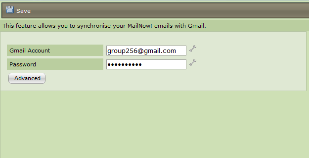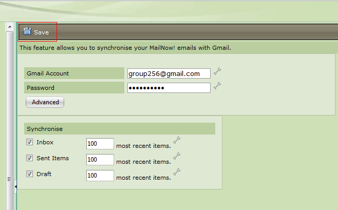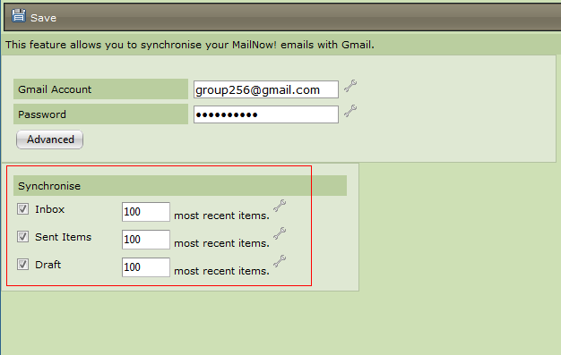 Under Advanced button, you can set which of the three folders of "Inbox", "Sent Items" and "Dratfs" to be synchronized with Gmail. You can also set the number of most recent emails in your MailNow! server to be synchronized with Gmail.