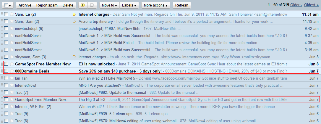 To be more clear, if you compare the Gmail mailbox (above image) with MailNow! Inbox (below image) you would notice all mails are synchronized except for those that are indicated in the red rectangles. Those emails are sent to user's Gmail account (i.e. group256@gmail.com) and as the result Cloud Sync will not synchronize those mails.